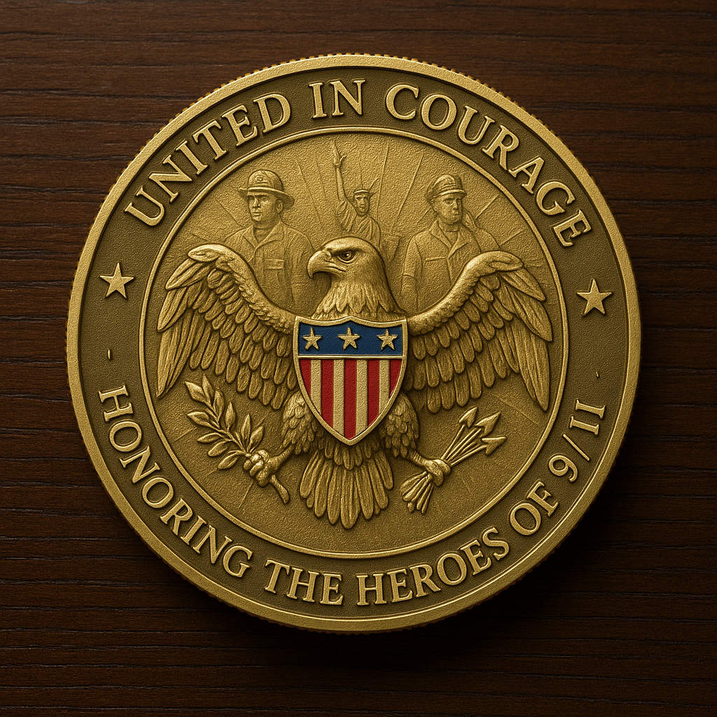 The reverse side of the coin continues the solemn tribute with a symbolic and heroic composition, centered on American unity, sacrifice, and resilience. The layout remains symmetrical and centered, keeping with the reverent tone of the coin.