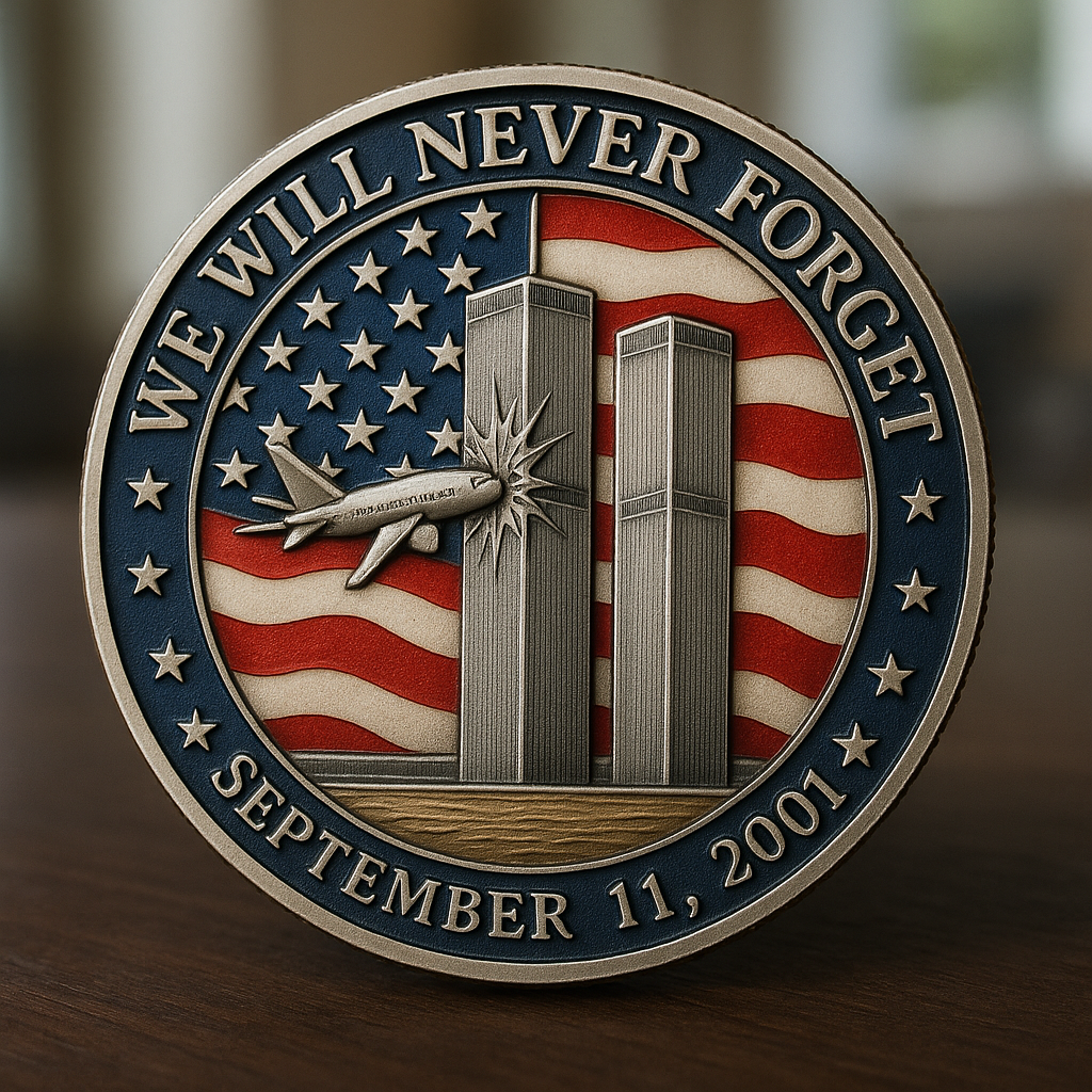 The coin’s edge is finely engraved with bold capital letters: "WE WILL NEVER FORGET", and the outer rim is surrounded by small five-pointed stars, symbolizing unity and patriotism.