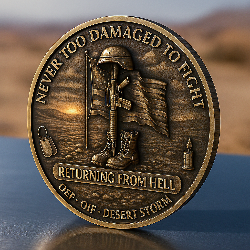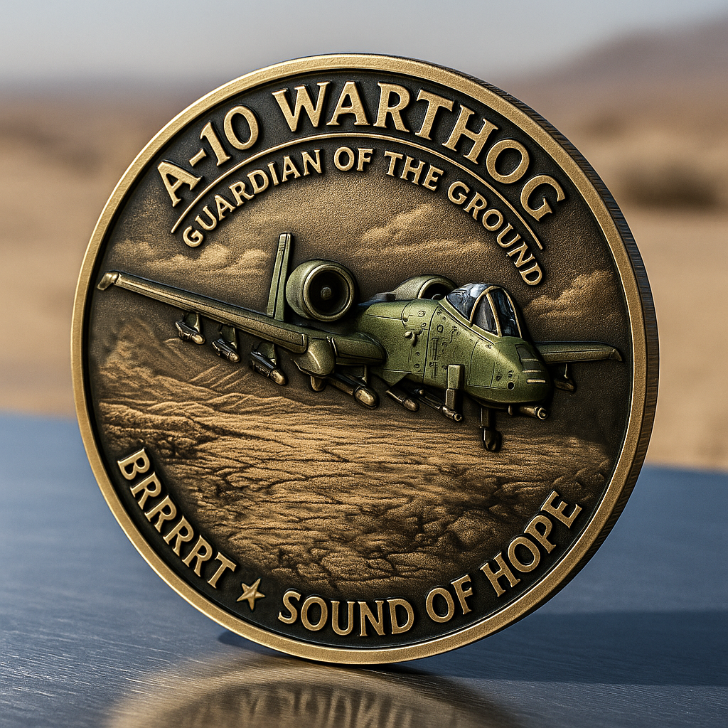 Crafted for those who served, and for those who never forgot the thunderous roar of the GAU-8 cannon, this coin features the iconic Warthog in full flight over a desert theater, captured with deep antique embossing and brass-toned metalwork.