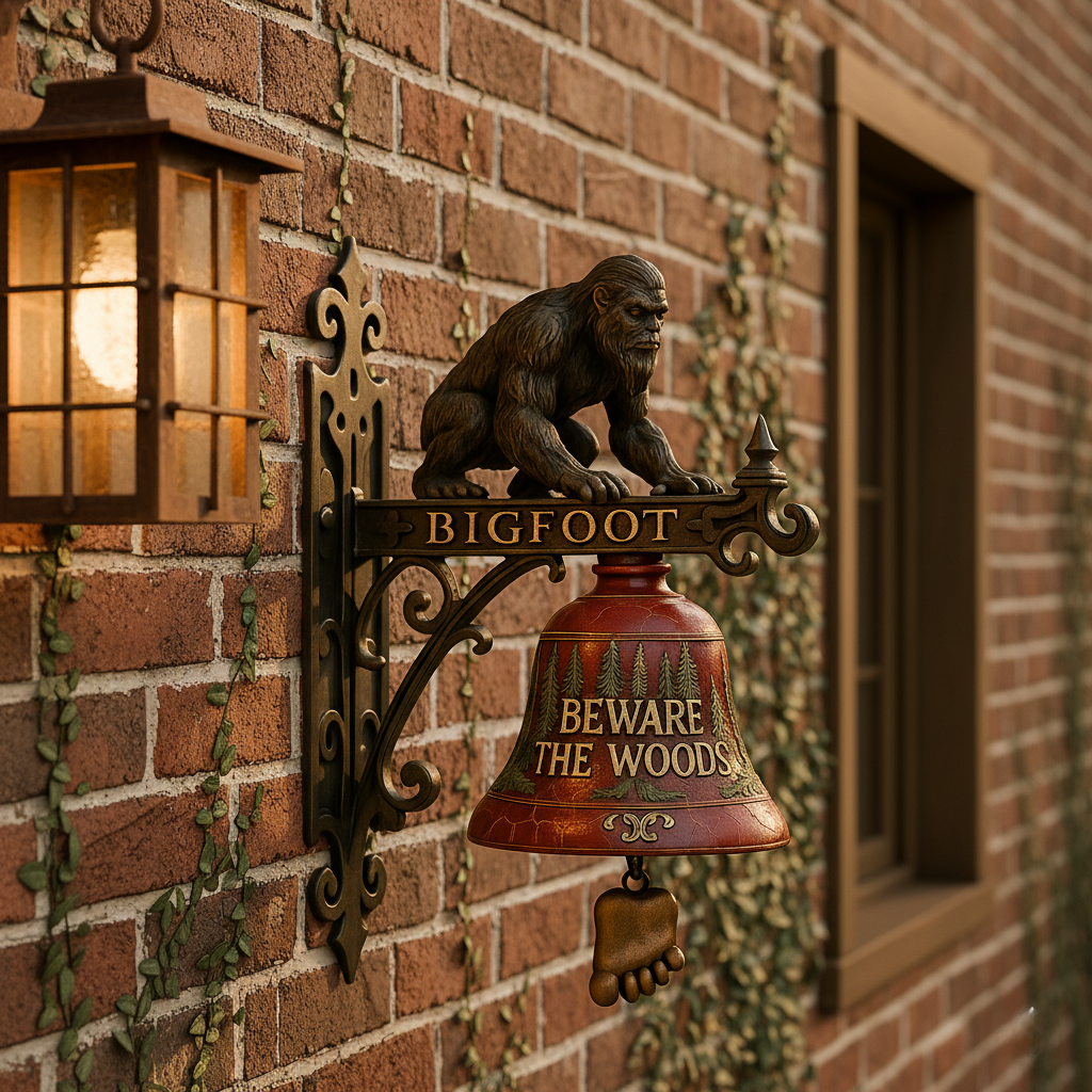 🔔Featuring a meticulously sculpted Bigfoot perched on a sturdy wrought-iron style bracket, and a bold “BEWARE THE WOODS” message on the bell itself, this unique piece is the perfect blend of spooky, funny, and collectible. It's more than just a bell – it's a conversation starter!