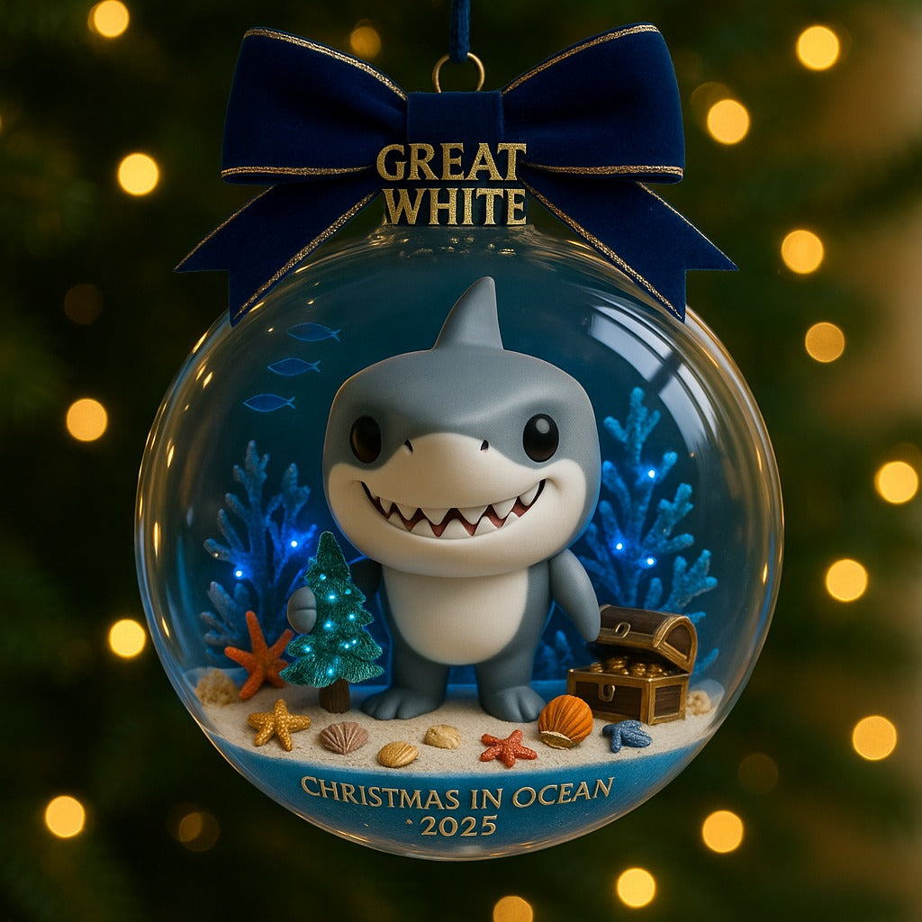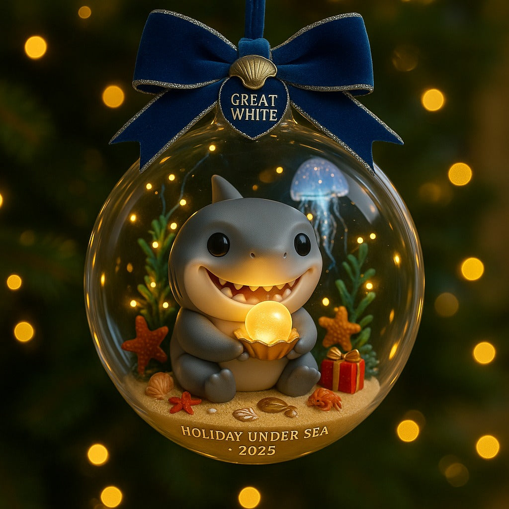 Make a splash this holiday season! Featuring a smiling Great White shark holding a Christmas tree, surrounded by corals, seashells, and a treasure chest, this ornament brings festive cheer straight from the deep blue sea. 🌊🎁