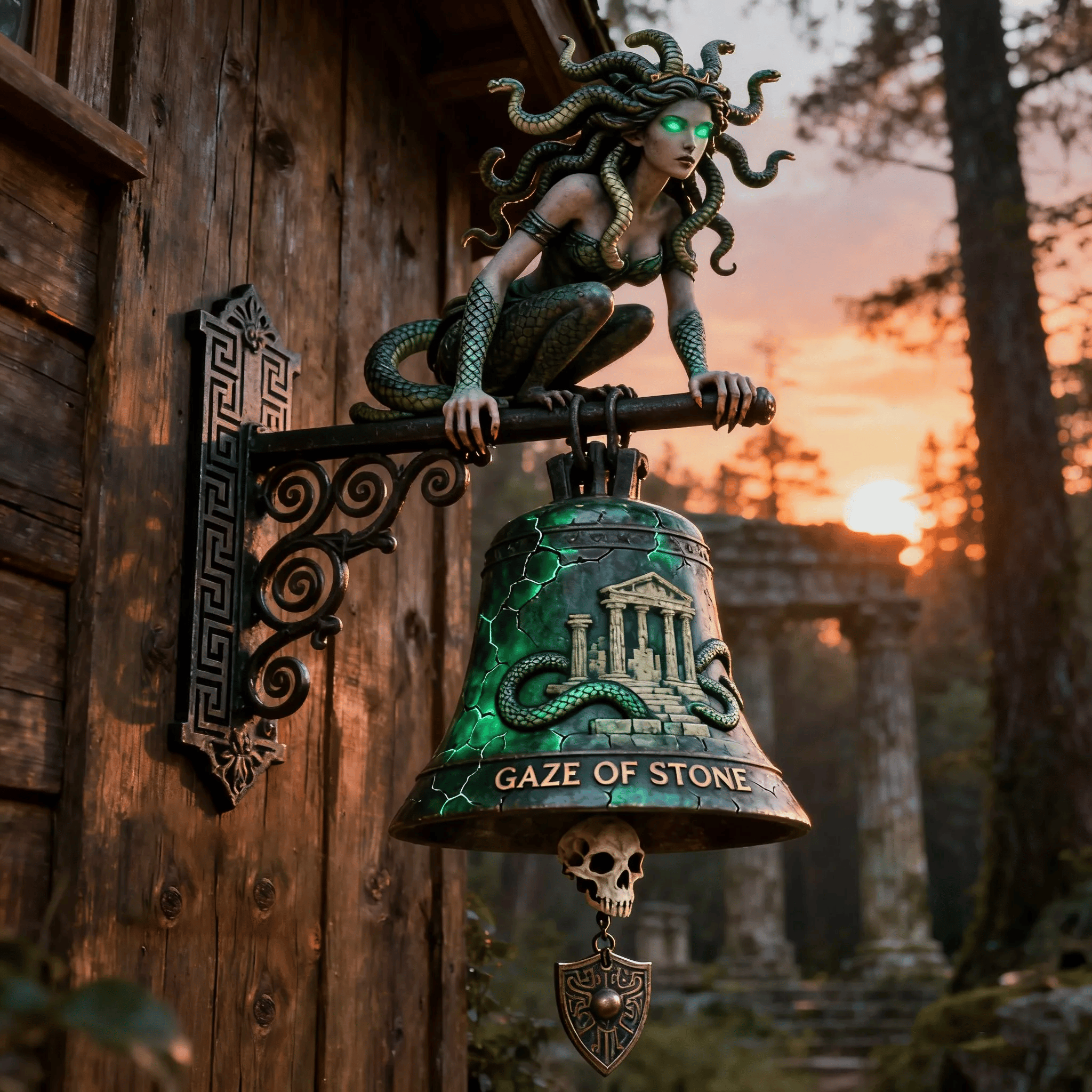 The gorgon queen coils with living serpents and glowing eyes above an emerald bell inscribed “GAZE OF STONE.” Ring the skull & shield clapper — if you dare meet her stare.