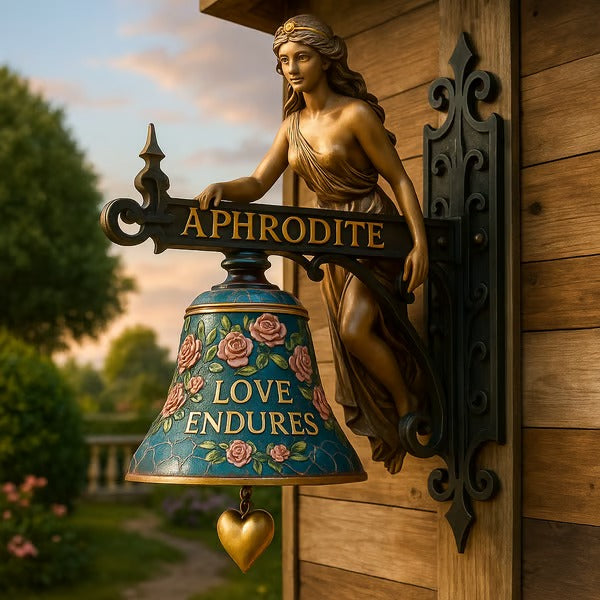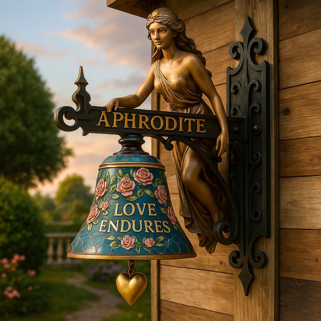 The goddess of love reclines in eternal beauty atop a rose-wreathed bell that whispers “LOVE ENDURES.” The golden heart clapper rings with warmth and timeless romance.