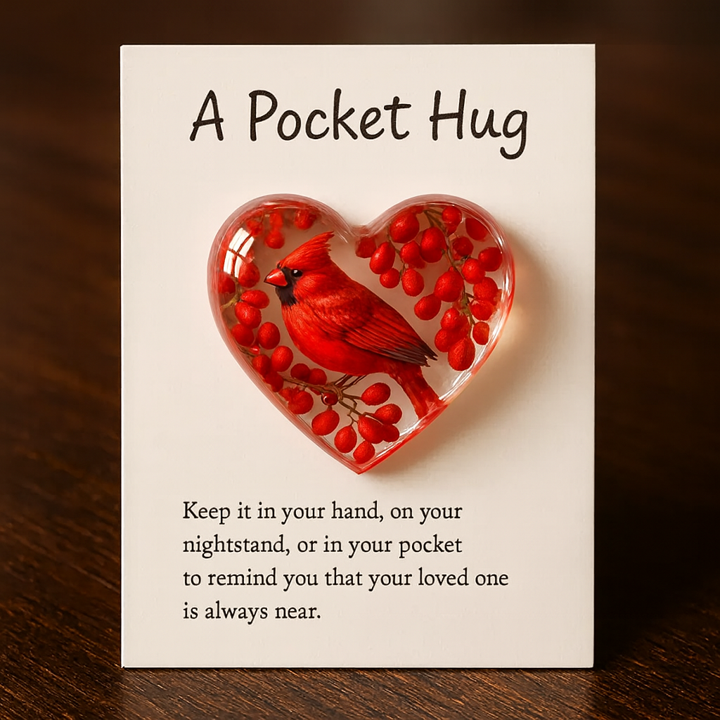 ✨When a Northern Cardinal appears, it’s said that a loved one is near.This little heart-shaped Pocket Hug carries that comforting spirit — a gentle reminder that love never truly leaves us.