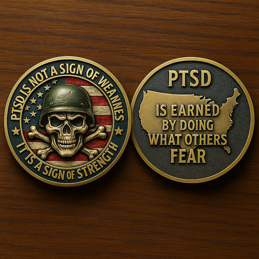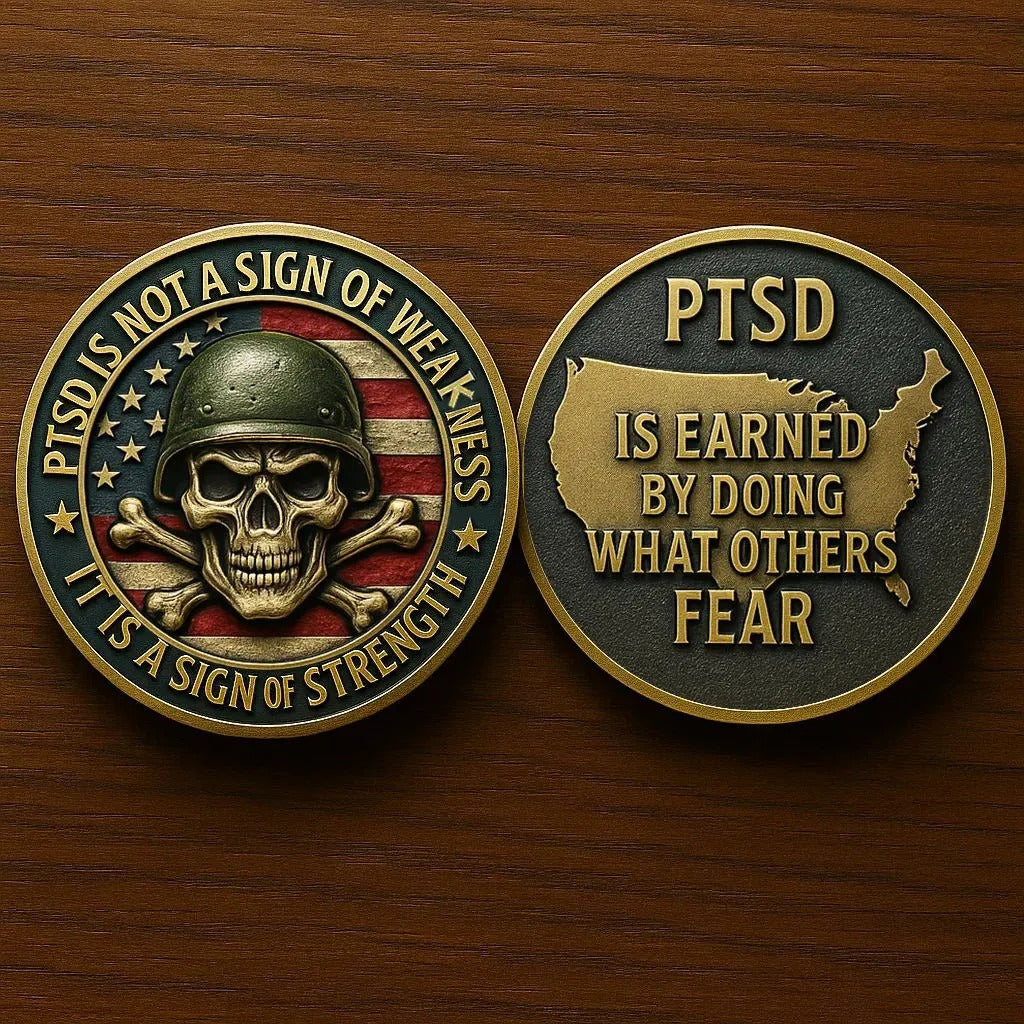 Back: A rugged map of the U.S. engraved with:“PTSD is earned by doing what others fear.”This coin isn’t about sympathy—it’s about respect. It’s for warriors who walked through hell and made it back.