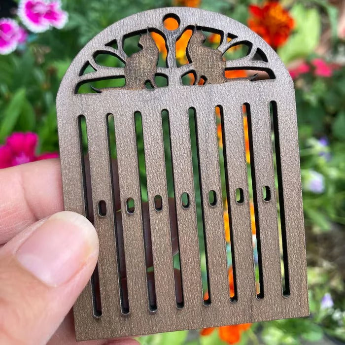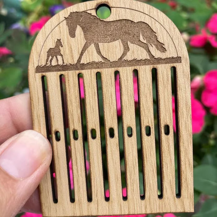 The heddle is 2 1/8" (5.5 cm) wide by 3" (7.5 cm) tall and the shuttle is 3" (7.5 cm) long. The heddle takes 15 threads. The kit comes with size 5/2 cotton thread but the heddle can be used with other thread/yarn.