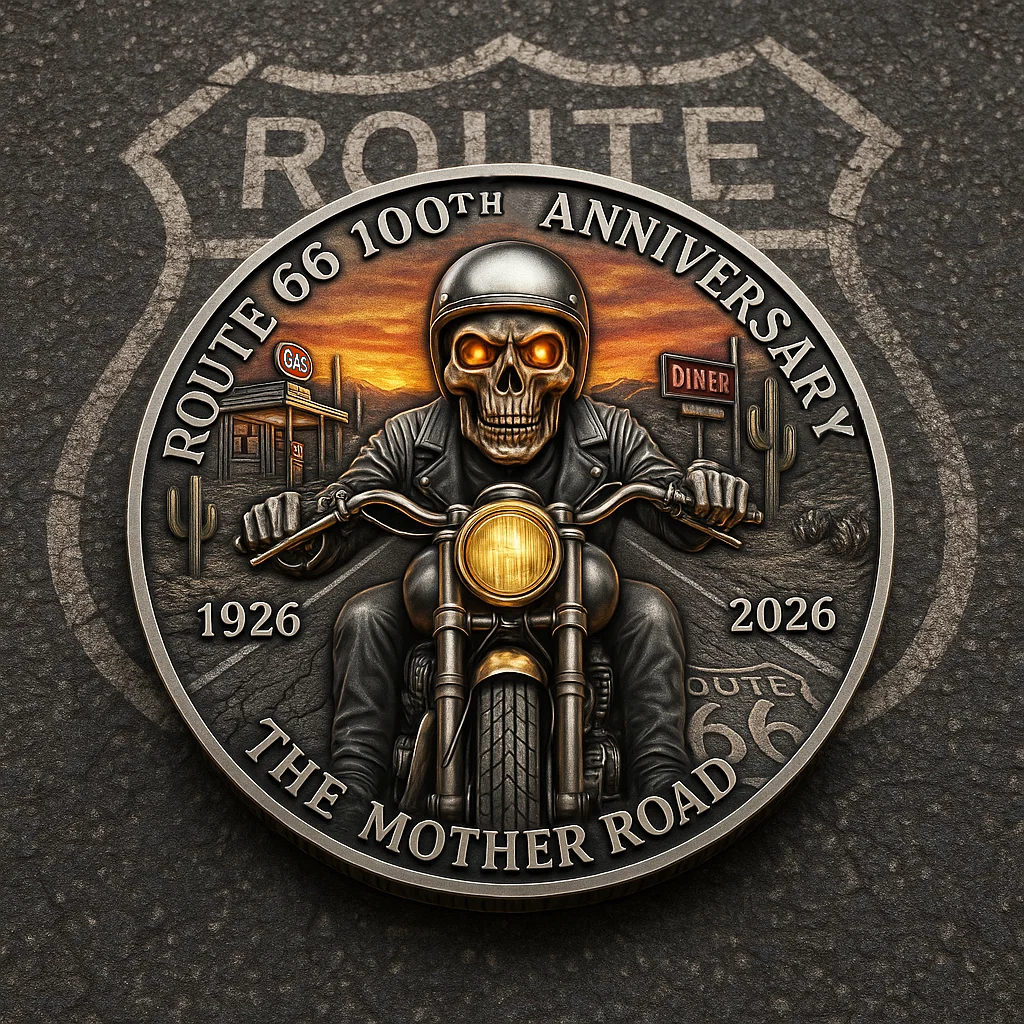 With 'Route 66' boldly displayed and the anniversary years 1926–2026 etched on the coin, this piece is a tribute to the open road, adventure, and the spirit of the American highway.