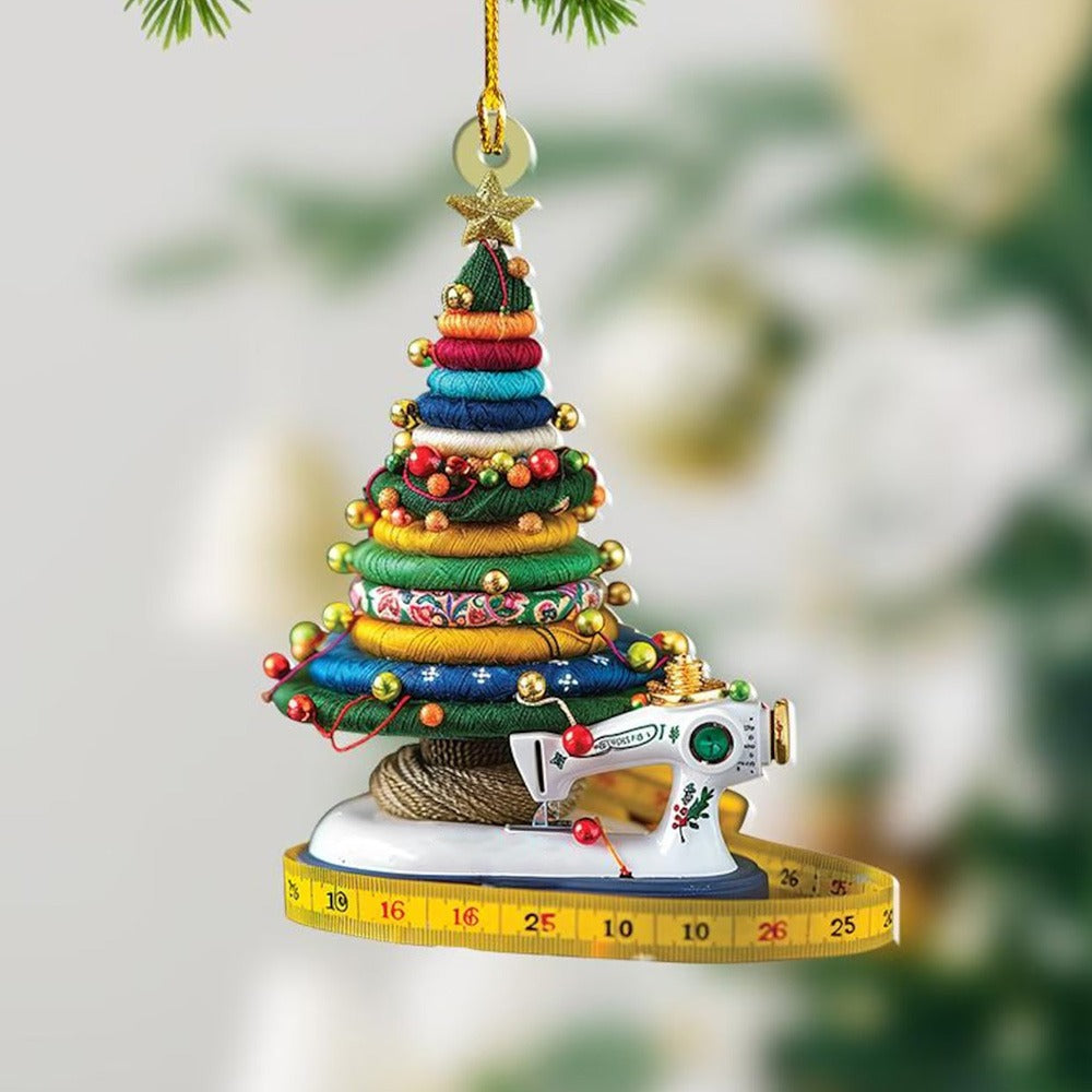 🤩Crafted in the shape of a whimsical Christmas tree, this ornament is stacked with colorful spools of thread, delicately wrapped in sparkling beads and topped with a golden star. At its base sits a charming miniature sewing machine, while a soft measuring tape encircles the scene — celebrating the joy of handmade creations.