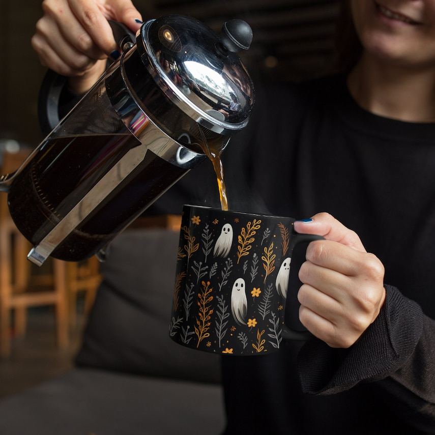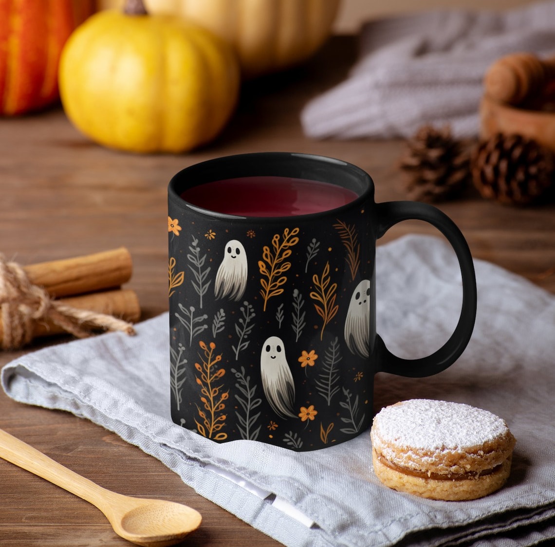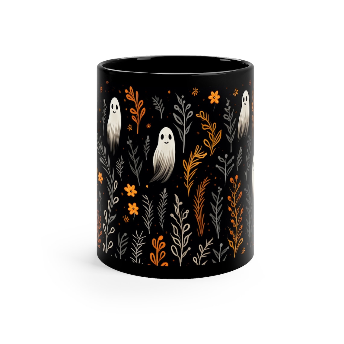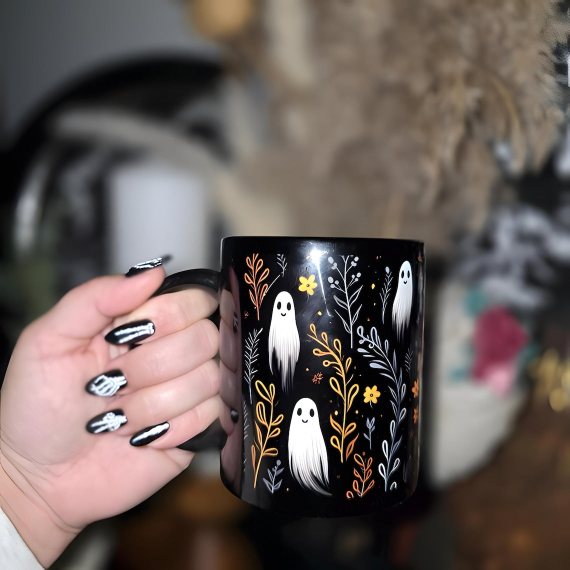 👻This mug features some friendly ghosts, complete with mischievous grins, all against a jet-black background. It's sure to add a touch of Halloween magic to your daily routine.
