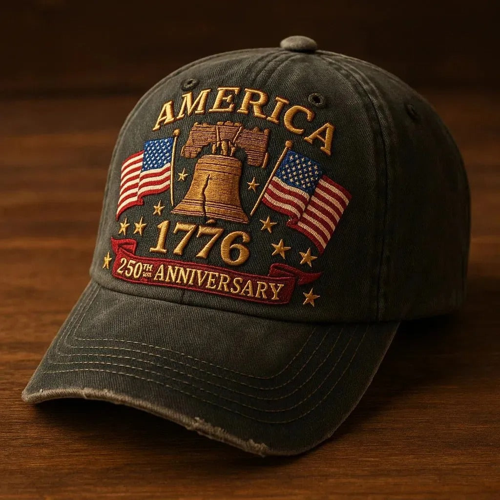 This 250th Anniversary cap proudly unites the red, white, and blue of the U.S. flag—symbolizing courage, hope, and unity—with gold embroidery that embodies honor and remembrance. It’s more than a cap—it’s a timeless tribute to freedom and pride.