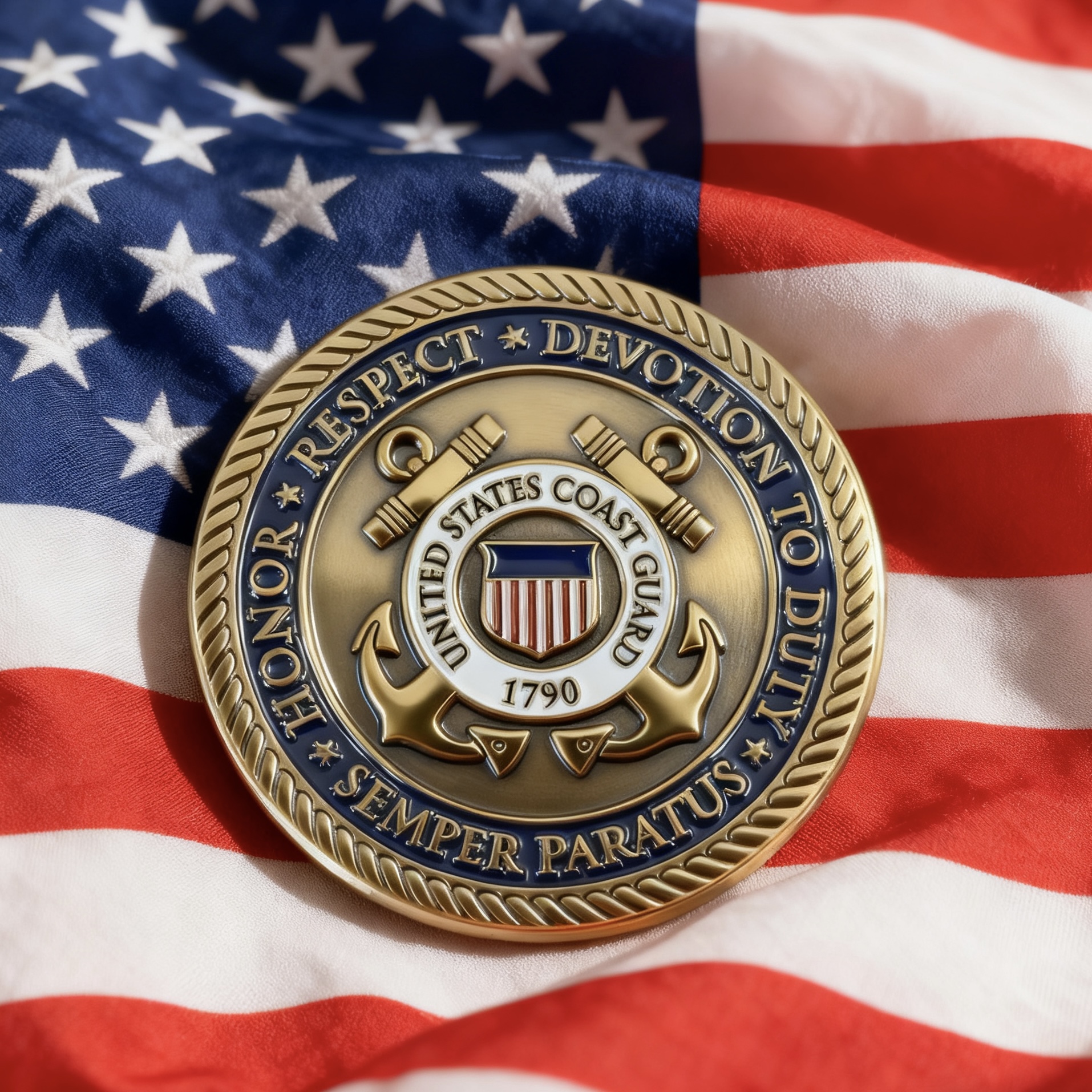 The obverse features a striking and heroic maritime motif. At the center stands Poseidon, god of the sea, wielding a golden trident symbolizing command and protection over the waters. Clad in golden, scale-like armor, his powerful stance conveys strength, vigilance, and guardianship. Behind him, the Statue of Liberty rises proudly as the American flag waves in the background — together embodying freedom, honor, and national pride. Surrounding him, crashing waves evoke the courage and perseverance of the Coast Guard in the face of the ocean’s challenges. Encircling the design are the inscriptions “UNITED STATES COAST GUARD” and “SEMPER PARATUS” (“Always Ready”), representing the service’s enduring mission and steadfast spirit.