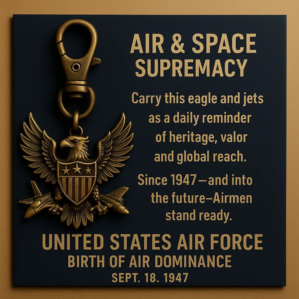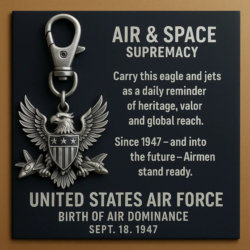 Celebrate the United States Air Force—born in 1947 and soaring ever since. This commemorative eagle-and-jets keychain honors air & space supremacy, valor, and global reach. Carry it daily as a reminder of service, heritage, and the Airmen who always stand ready.